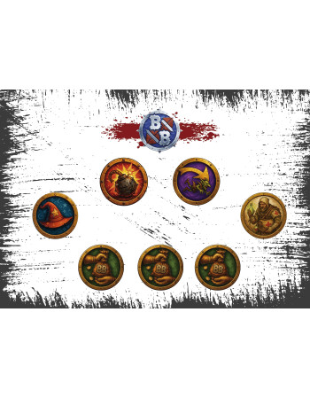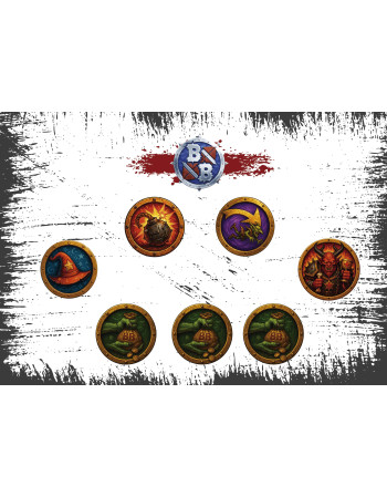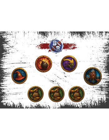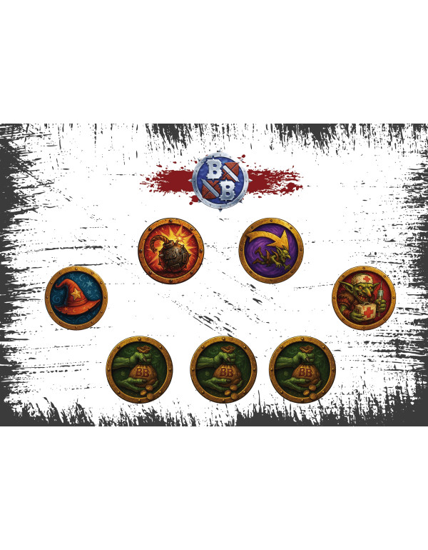 Set de 7 fichas de incentivos para Blood Bowl, MDF de 25 mm a todo color. Incluye fichas de soborno, mago, boticario, bomba y lanzar compañero. Diseños temáticos por equipo: Goblin, Caos, Enano, Humano, Orco o Elfo